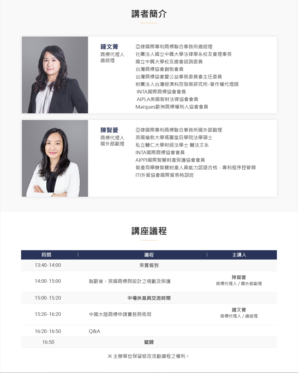 亞律掌握英國智慧財產局最新相關機制,將藉由此次機會為權利人說明英國脫歐後,商標與設計該如何規劃與保護。