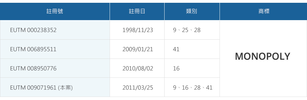 知名桌遊公司 ─ 孩之寶公司(Hasbro, Inc.) 於2010年的商標註冊案,編號009071961「MONOPOLY」與其在先商標重複的部分被判定為惡意註冊,因此無效,為2021年歐盟商標中最受人討論的案件,本文以此案為基礎,淺談歐盟及台灣對於重複申請商標是否構成惡意。